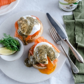- Once toasted, spread the crumpets with butter, top with smoked salmon, the poached eggs and spoon over the dill sauce
